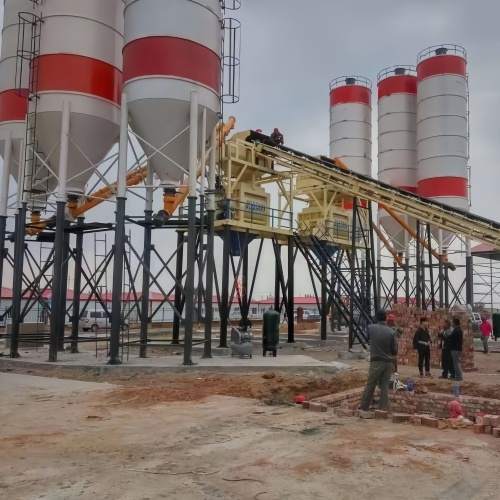The general workflow is as follows: Aggregates are batched by a batching machine and transported to a storage silo via a belt conveyor; powdered materials are transported via a screw conveyor; all raw materials are mixed in a mixer; and finally, concrete is discharged.